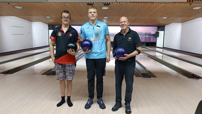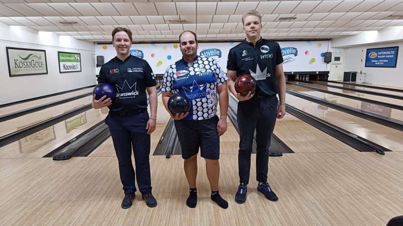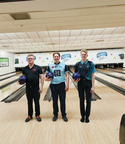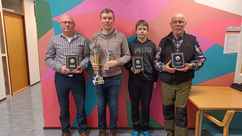 Kouvolan Seudun Keilailuliiton syyskokouksessa palkittiin menneen talven menestyjiä. Kuvassa Aimo Gren (vas.) veteraanien SM-paripronssi, Maunu Talonpoika Fair Play -pokaali, Leo Lähde ikäkausimestaruus ja Markus Sihvola veteraanien SM-paripronssi. Lisäksi palkittiin Niko Oksanen miesten SM-kulta ja Essi Pakarinen naisten SM-hopea.