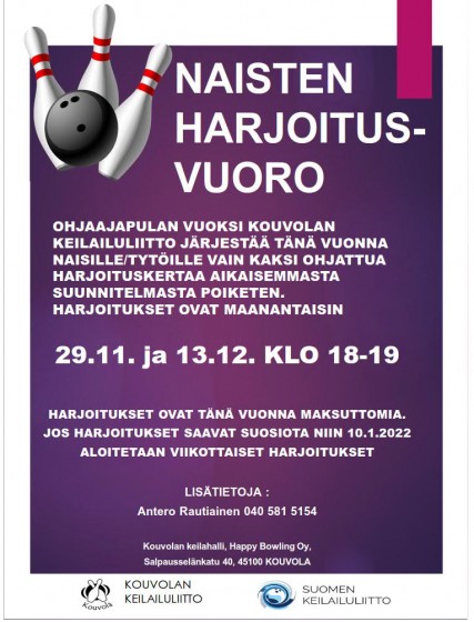 Kouvolan Keilailuliiton junioriharjoitukset, JuniorRanking ja naisten harjoitusvuorot jatkuvat helmikuusta alkaen. Lisätiedot löytyvät oheisista mainoksista.