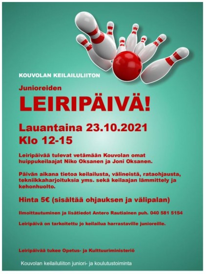 Kouvolan Keilailuliitto järjestää keilaaville junioreille leiripäivän lauantaina 23.10.2021 kello 12.00-15.00. Leiripäivän aikana osallistujat saavat tietoa keilailusta, välineistä, lämmittelystä ja kehonhuollosta. Lisäksi ohjelmassa on rataohjausta ja tekniikkaharjoituksia. Leiripäivän ohjaajina toimivat Niko Oksanen ja Joni Oksanen. Tapahtuman hinta on 5 € / henkilö (sisältää ohjauksen ja välipalan).