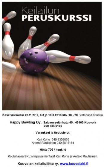 Kouvolan Keilailuliitto järjestää keilailun peruskurssin 20.2. alkaen. Kurssi sisältää kahdeksan tuntia opetusta neljänä peräkkäisenä keskiviikkona. Kurssipäivät ovat 20.2., 27.2., 6.3. ja 13.3. Kurssin hinta on 70 euroa/henkilö. Kouluttajina toimivat Suomen Keilailuliiton kilpavalmentajat Kari Korte ja Antero Rautiainen.