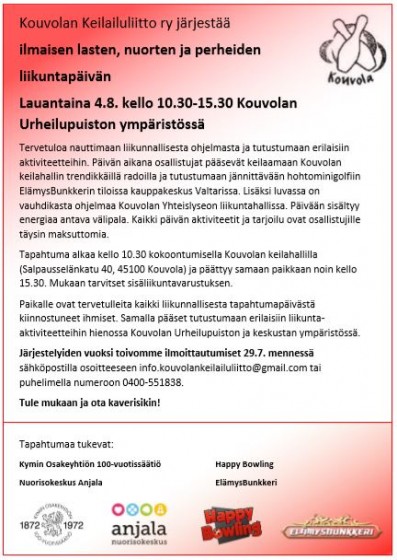 Kouvolan Keilailuliitto järjestää lasten, nuorten ja perheiden ilmaisen liikuntapäivän lauantaina 4.8. kello 10.30-15.30 Kouvolan Urheilupuiston ympäristössä.