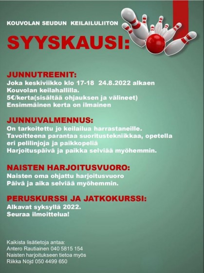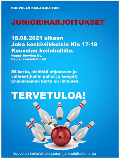 Kouvolan Keilailuliiton suositut junioriharjoitukset alkavat syksyn osalta keskiviikkona 24.8. kello 17.00-18.00. Mukaan ovat tervetulleita kaikki entiset ja uudet keilailusta kiinnostuneet nuoret.