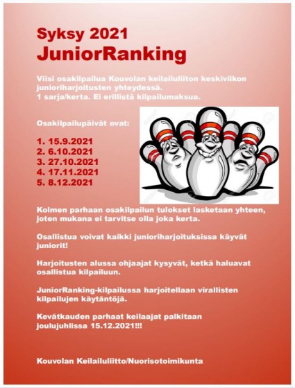 Lisäksi Kouvolan Keilailuliitto järjestää motivoituneille nuorille juniorivalmennusta. Valmennuksen ajankohta selviää myöhemmin. Lisätietoja saa ohjaajilta keskiviikon junioriharjoitusten yhteydessä.